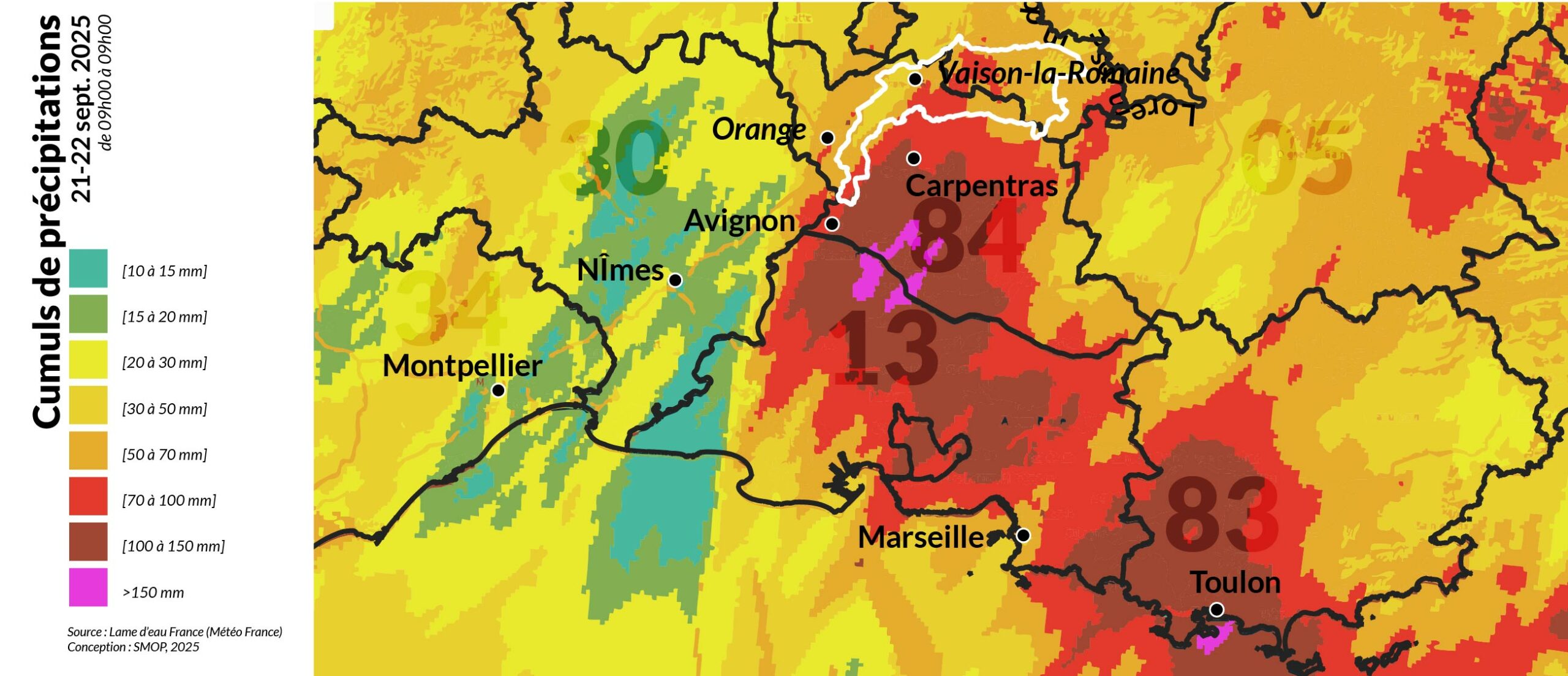 Après un premier événement le 1er septembre, le dernier jour de l’été 2025 aura donc été marqué par un nouvel épisode méditerranéen. Cette fois, c’est l’Ouest et le Sud de la Région Provence-Alpes-Côte d’Azur qui ont été concernés par cet épisode marqué par des conditions orageuses intenses et des cumuls de précipitations très importantes (supérieures à 100 mm voire supérieures à 150 mm localement) sur une large partie des départements de Vaucluse, des Bouches-du-Rhône et du Var. Légèrement en marge des plus fortes précipitations, l’Ouvèze provençale avait toutefois été placée en vigilance jaune crues à compter du dimanche midi, justifiant une nouvelle fois un suivi renforcé de la situation par le SMOP.